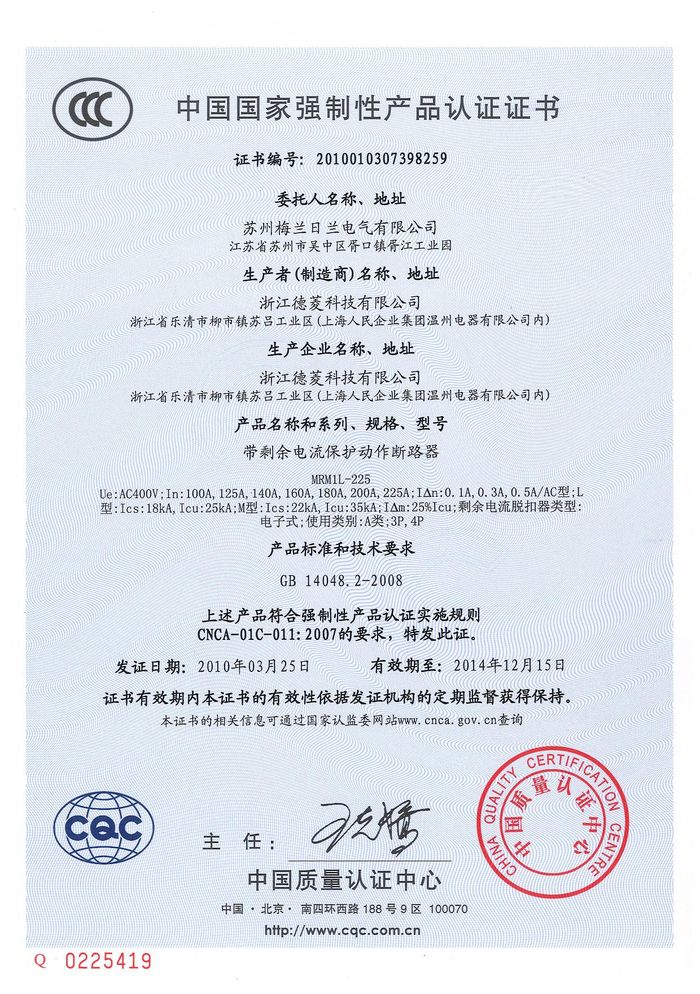 MRM1L-225塑殼漏電資質(zhì)證書