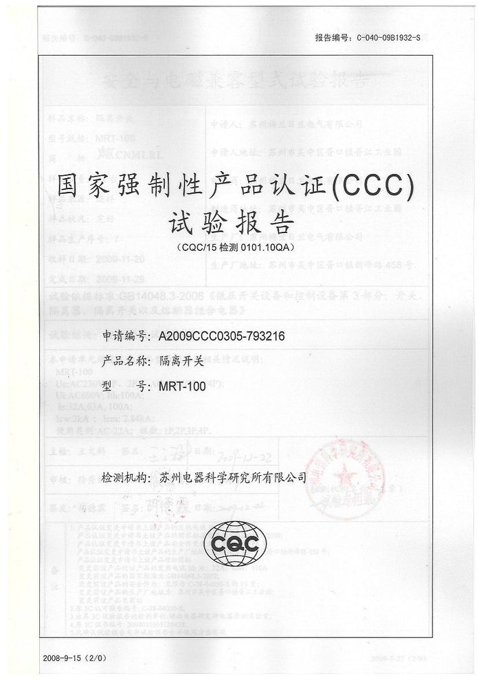 MRT-100隔離開關(guān)資質(zhì)證書