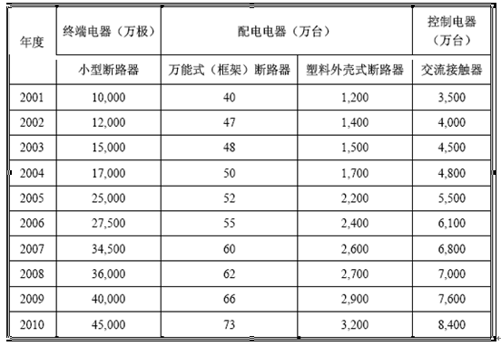我國低壓電器行業(yè)2001 至2010 年發(fā)展良好,基本每年有10%-15%的增長幅度,2010 年全國低壓電器工業(yè)總產值約為500 億元,其中終端電器約為60 億元,配電電器約為220 億元,控制電器約為165 億元,其他電器約為55 億元(主要指控制電路電器,如按鈕、信號燈、行程開關等)。