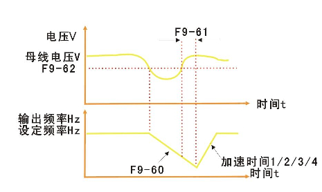 此功能指在瞬時停電時變頻器不會停機(jī),在瞬間停電或電壓突然降低的情況下,變頻器降低輸出速度,通過負(fù)載回饋能量,補償電壓的降低,以維持變頻器短時間內(nèi)繼續(xù)運行。
