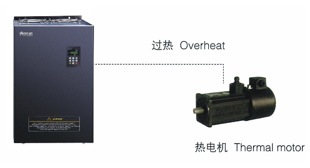 選用輸入輸出擴(kuò)展卡,模擬量輸入A13可接受電機(jī)溫度傳感器輸入(PTlOO,PTlOOO)。當(dāng)電機(jī)溫度越過預(yù)警值時,變頻器輸出脈沖信號提示過熱,當(dāng)電機(jī)溫度超過過熱保護(hù)值時,變頻器故障輸出給電機(jī)妥善的保護(hù)。