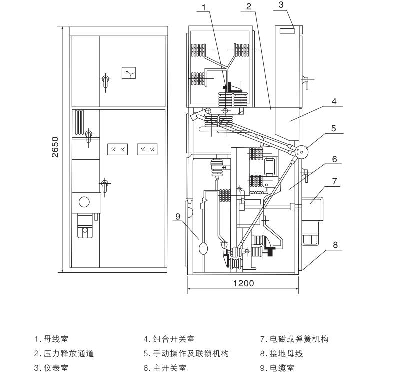 本開關(guān)柜為金屬封閉箱型結(jié)構(gòu),柜體骨架由角鋼焊接而成.柜內(nèi)用鋼板分隔成斷路器室,母線室,電纜室,繼電器室,并可通過門面上的觀察窗和照明燈觀察柜內(nèi)各主要元件的運(yùn)行情況。為提高開關(guān)柜的技術(shù)性能,各主要元件進(jìn)行了重新設(shè)計(jì)(如斷路器,旋轉(zhuǎn)式隔離開關(guān)等),根據(jù)柜體布置,繼電器室可安裝繼電器,門上可裝設(shè)信號(hào)繼電器、指示儀表、信號(hào)燈,轉(zhuǎn)換開關(guān)安裝于操作小室。后面為母線室,下面為電纜室,用戶可方便地進(jìn)行接線,前面為斷路器室,方便了開關(guān)柜主開關(guān)的檢修,柜體內(nèi)部機(jī)構(gòu)參見圖1、圖2和產(chǎn)品說明書。